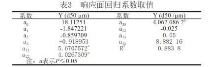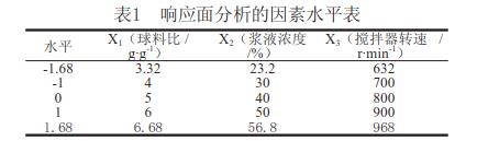 利用響應(yīng)面分析法[1]化枸杞子渣超微粉碎工藝參數(shù)。在單因素預(yù)試驗(yàn)基礎(chǔ)上,用SAS軟件系統(tǒng)進(jìn)行響應(yīng)面分析,設(shè)計(jì)一個(gè)三因素五水平的回歸方程來擬合因素和指標(biāo)(響應(yīng)值)之間的函數(shù)關(guān)系。選擇球料比(X1)、枸杞子渣漿液濃度(X2)和攪拌器轉(zhuǎn)速(X3)作為因素,以粉碎后的顆粒粒度d50作為響應(yīng)值對(duì)球磨機(jī)濕法超微粉碎工藝進(jìn)行化。