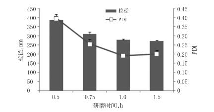 2.1.3研磨時(shí)間的篩選稱(chēng)取BRE原料藥7.5g,置于含有吐溫80(1.125g)的水溶液(22.5mL)中,攪拌混懸,加入氧化鋯珠(粒徑為0.6mm)450g,分別研磨0.5、0.75、1.0、1.5h,制備3批BRE納米晶混懸液。以BRE納米晶混懸液的粒徑、PDI為指標(biāo),篩選研磨時(shí)間。結(jié)果,隨著研磨時(shí)間的延長(zhǎng),BRE納米晶混懸液的粒徑、PDI逐漸減?。谎心?.5、0.75、1.0h時(shí),BRE納米晶混懸液的粒徑、PDI減小的幅度較大;研磨1.5h時(shí),BRE納米晶混懸液粒徑雖然較研磨1.0h時(shí)的粒徑減小,但減小幅度不大。綜合考慮能耗和時(shí)間,確定研磨時(shí)間為1h。研磨時(shí)間的篩選結(jié)果見(jiàn)圖3。